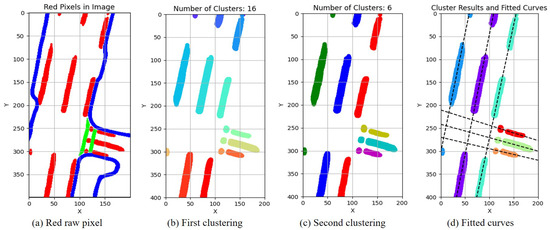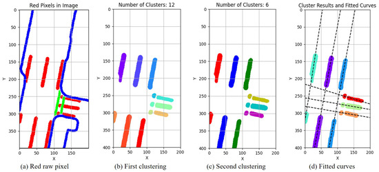 Lane lines clustering and fitting results of HD map (Frame 553). (a) The red pixels represent lane lines, and they need to be clustered and fitted, while pixels in blue and green are not considered. (b) After the first clustering, the lane lines form 12 clusters, represented by different colors. (c) After the second clustering, the lane lines form 6 clusters, represented by different colors. (d) After the second clustering, curves fitted to the lane lines.