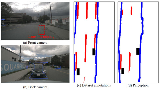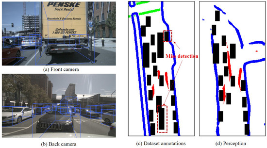 If a large number of objects were detected in a crowded scenario, leading to significant occlusion, the detection of static elements like lane lines was intermittent. In that case, the detection effectiveness between static and dynamic elements was poor. In such a scenario, where there was a high level of uncertainty regarding the existence and spatial information attributes of both static and dynamic elements in perception, it can be considered that analyzing uncertainty through the matching of static elements in perception with high-definition map features reflects the uncertainty of dynamic elements. Typical scenarios with poor perception effectiveness are shown in Figure 11.