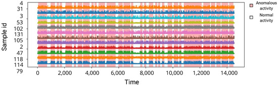 The dataset exploited in this research is the heart rate time series from the Massachusetts Institute of Technology (MIT), publicly available online (https://www.kaggle.com/datasets/ahmadsaeed1007/heart-rate-time-series-mitbih-database, accessed on 13 December 2023). The data are prepared for ML processing and consist of 1800 measurements evenly spaced at intervals of 0.5 s, measured for up to a total of 15 min of monitoring. Readings are captured from 12 sensors (electrodes) on the chest. A visualization of the dataset can be observed in Figure 1. The shown features are time steps that have shown the highest importance following the best-model analysis described later in this work. Normal activity is indicated by a white background while anomalous activity has a red background. Anomalous activity can be considered as any irregular or abnormal heartbeat, otherwise known as an arrhythmia [64].