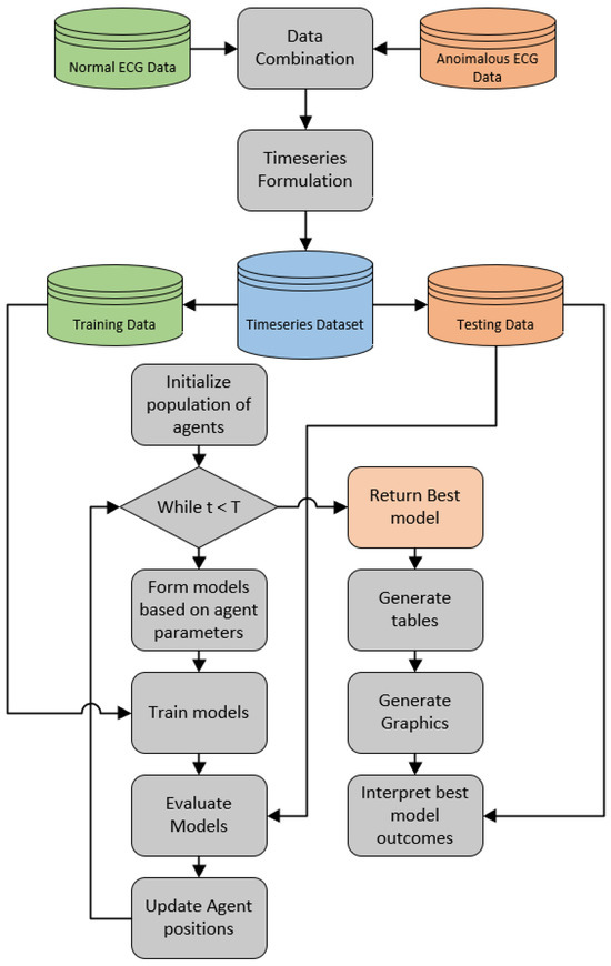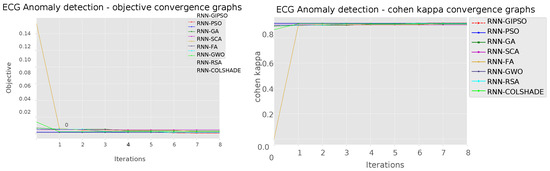 For this study, a recurrent neural network (RNN) is selected as the predictor of heart conditions due to its high performance with time-series prediction tasks [10]. RNNs can form feedforward along with feedback connections, with the latter being activated with a delay to ensure the forming of long-term dependencies. This aspect of the RNN architecture makes them well-suited for detecting heart-related diseases, given that these conditions develop slowly over time. The idea is to provide a model that can allow for early detection of these conditions, which has not been achieved in this manner to date. In this context, early detection and rapid diagnostics are crucial as they allow timely intervention and management, potentially preventing complications and improving patient outcomes. The particle swarm optimization (PSO) algorithm, belonging to the swarm intelligence algorithm family, has been selected as an optimizer for the RNN hyperparameters. By applying this principle, the experimentation can result in a model that is as close as possible to optimal, as defined by the NFL. The problem of health predictions based on waveforms belongs to the group of problems of non-deterministic polynomial time complexity (NP-hard). For this type of problem, swarm metaheuristics have proven excellent optimizers. The proposed method was tested against other RNN models optimized by other high-performing metaheuristics for the purpose of results comparison.