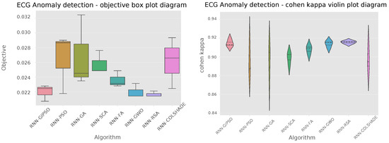The conducted research applied metaheuristic algorithms in order to optimize an RNN architecture and training parameters in order to construct models that demonstrate the best results when applied to ECG anomaly detection and classification. A total of seven contemporary metaheuristics were assessed for their ability to optimize hyperparameters and the constructed models were applied and evaluated on a publicly available real-world dataset. An additional modified metaheuristic was introduced that combined ideas borrowed from the GA and incorporated them into the PSO algorithm to improve performance. Several metrics were included in order to provide in-depth comparisons between algorithms. The introduced algorithm created the single best-performing model, outperforming the base PSO algorithm as well as the GA, attaining an accuracy of . Improvements to the exploration and exploitation power of the algorithm were observed in the modified metaheuristic. Additionally, it is important to note the observed great performance of the RSA as well, which demonstrated good performance despite not attaining an optimal model. The constructed models were rigorously statistically validated to confirm the improvements, and the best-performing model was subjected to rigorous sensitivity analysis to attain further insight into the decision-making process.