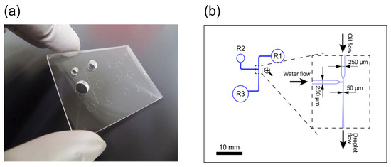 (a) Photo of a polydimethylsiloxane (PDMS) microfluidic sheet. (b) Drawing of a microfluidic channel pattern with the terminal reservoirs on the PDMS sheet and an enlarged view of the T-channel junction. R1 and R2 represent reservoirs for oil and aqueous phase loading, respectively, whereas R3 indicates an outlet space into which droplets generated at the T-channel junction flow.