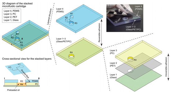 The construction of the microfluidic cartridge comprised four distinct layers: a thin glass slide (Layer 1, situated at the bottom), a polyethylene terephthalate (PET) film coated with adhesive on both sides (Layer 2), a polycarbonate (PC) plate (Layer 3), and an uppermost layer consisting of a PDMS sheet (Layer 4) (See Figure 2). The PC plate (70 mm × 50 mm × 4 mm) featured a 10 mm diameter opening, serving as the PCR chamber (R4 in Figure 2), and it was affixed to a thin glass slide (70 mm × 50 mm × 0.15 mm) by means of a thin layer (0.1 mm thick) of double-sided adhesive PET film. This film possessed a punched hole with a diameter of 10 mm, strategically positioned just below R4. The aforementioned PDMS microfluidic sheet was attached to the PC plate through the reversible adherence facilitated by the viscoelastic properties of PDMS (consult the photograph in the upper right corner of Figure 2). In this configuration, R3 was situated directly above R4.