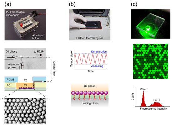 Approximately 15 min after the initiation of droplet generation, the creation of droplets was halted, and the top PDMS layer was carefully lifted off the surface of the PC layer. Prior to removing the PDMS sheet, 160 µL of the oil phase was extracted from R4 to prevent spillage of the oil phase from R4. The resulting assembly of glass/PET/PC containing the reaction chamber was then transferred to a flatbed heating block of a thermal cycler (Mastercycler nexus flat, Eppendorf Japan, Tokyo, Japan) for 30 cycles of PCR amplification (refer to Figure 3b). Fluorescence images of the thermally cycled droplets were captured using an inverted fluorescence microscope equipped with an electron multiplier charge-coupled device camera (iXonEM+; Andor, Belfast, Northern Ireland) (see Figure 3c). Software bundled with the camera was employed to measure the fluorescence intensities of the droplets.