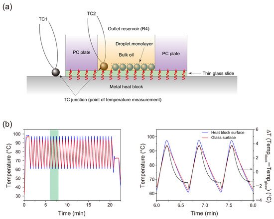 (a) Illustration of the PCR chamber (i.e., R4) with the thermocouples (TCs: TC1 and TC2) arranged to monitor temperatures on the metal heat block surface and the glass slide surface (with the covering oil), respectively, during thermal cycles. (b) Temperature vs. time traces for the surfaces of the aluminum heat block and glass slide. The thermal cycling conditions applied to the droplet samples were as follows: an initial activation period lasting approximately 40 s within the range of 94 to 98 °C, 30 cycles of a two-step thermal profile consisting of ~1 s at 94 °C for denaturation and ~2 s at 63 °C for combined annealing and extension, and an additional final extension of approximately 1 min at 72 to 73 °C. We obtained the profiles for the metal block surface (blue solid line) and for the glass slide surface (red solid line) upon programming the instrument to denature at 99 °C for 0 s and perform annealing/extension at 58 °C for 0 s at the fastest temperature ramp rate for the 30 cycles. The right panel exhibits an enlarged view of the green-shaded area shown in the left panel.
