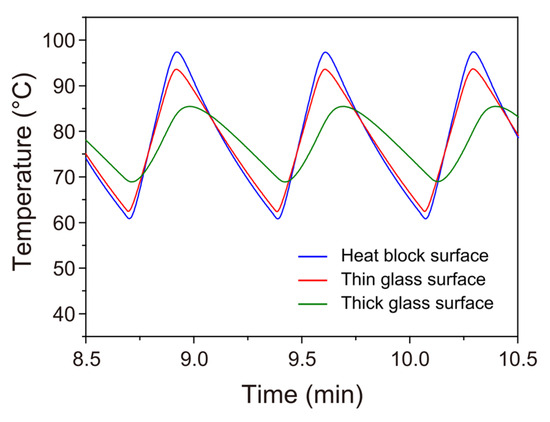 Furthermore, Figure 5 shows the temperature–time profile resulting from the application of the same temperature program after replacing the bottom thin glass layer of the microfluidic cartridge with a glass plate of 1.1 mm thickness, alongside the temperature–time profile for the case of the thin glass slide as a comparative reference. The increase in glass plate thickness substantially lowered the temperature ramp rates (1.0 °C/s during heating and −0.7 °C/s during cooling), with the upper turnaround temperature reaching only 86 °C and the lower turnaround temperature reaching 69 °C, deviating considerably from the target temperatures of 94 and 63 °C, respectively. In the instance of utilizing the microfluidic cartridge featuring the thicker glass plate as the base, PCR amplification did not succeed.