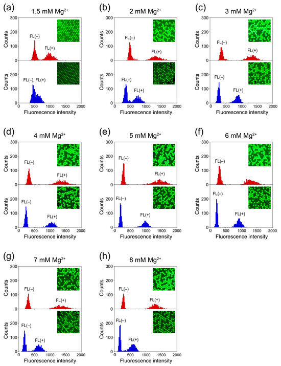 Figure 7 summarizes the mean fluorescence intensities of FL(+) droplets resulting from five repeated experiments, each applying a standard cycle and a fast cycle at each Mg2+ concentration. Notably, under the application of the fast cycle, the fluorescence intensity exhibited a decline as Mg2+ concentrations exceeded 6 mM. This occurrence stands in contrast to the situation observed during the use of the standard cycling protocol. An excess of Mg2+ stabilizes DNA duplexes, preventing complete denaturation and reducing yield [40,41]. From this perspective, we speculate that the abbreviated duration spent at the denaturation temperature during the fast cycle hindered adequate denaturation of stabilized DNA duplexes because of the presence of surplus Mg2+, leading to this decrease in yield.