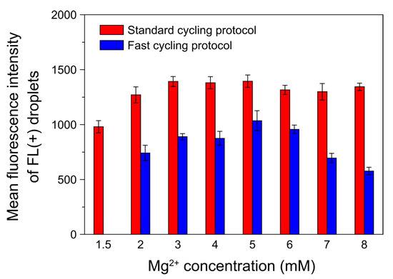 In PCR, magnesium ions (Mg2+) play a crucial role as cofactors in activating DNA polymerase. Generally, increasing the concentration of Mg2+ enhances the yield of PCR products [40]. However, an excessive Mg2+ concentration can lead to reduced specificity because of the stabilization of improper annealing of primers to incorrect template sites, potentially resulting in unintended PCR products [40,41]. Conversely, too low an Mg2+ concentration might lead to insufficient or no PCR product generation [40,41]. There is no single Mg2+ concentration that ensures PCR amplification in all situations, and the optimal Mg2+ concentration must be determined experimentally for each sample. Nevertheless, standard PCR protocols usually suggest a final Mg2+ concentration of 1.5 mM [42]. Many manufacturers’ DNA polymerases are supplied with 10× PCR buffer containing 15 mM Mg2+. Therefore, in our previous study [35], we performed droplet PCR by the standard cycling protocol starting with an Mg2+ concentration of 1.5 mM and also higher concentrations (up to 8 mM) to optimize the Mg2+ concentration. The fluorescence intensity of the FL(+) droplet population increased as the Mg2+ concentration increased from a value of 1.5 to a value of 2 mM and then to 3 mM, but thereafter, the fluorescence intensity of the FL(+) droplet population remained almost the same. In the present study, we investigated the effect of Mg2+ concentration on the separation of FL(+) and FL(−) droplet populations when applying the fast cycling protocol compared with that when applying the standard cycling protocol.