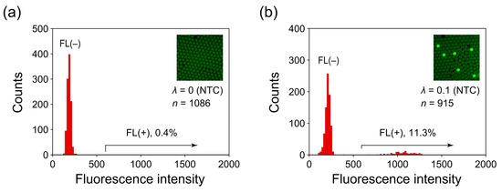 Histograms of hexachloro-fluorescein (HEX) fluorescence of thermocycled droplets for (a) no-template control (NTC) and (b) positive control experiments. The preset λ values, total droplet sample number, and percentage of fluorescence-positive FL(+) droplets in the distribution are indicated in the individual panels.