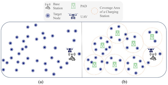 With the advancement of wireless power transfer technologies, researchers have developed a novel wireless charging station, known as PAD, for charging UAVs [9,10]. Consequently, an energy-depleted UAV can instead head to a nearby PAD for energy replenishment. This approach enhances the UAV’s operational time and spatial coverage, as well as reduces the frequency of repetitive flights to the BS for charging. PAD technology has demonstrated its effectiveness in wireless rechargeable sensor networks (WRSNs). In these networks, PADs can be strategically placed in advance to recharge UAVs, which then act as mobile chargers for the sensor nodes.