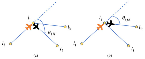 In most previous studies, the energy consumption of the UAV during flight was assumed to be directly proportional to the distance traveled, without consideration of the real-world circumstances. In actuality, the UAV must adjust its orientation during turns, which affects energy consumption and consequently influences the UAV’s chosen route. As depicted in Figure 3, when the UAV flies from point to point , the distances to reach and are equal.