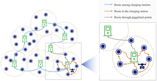 Considering the remote-sensing mission of the UAV, the UAV starts from the BS and ends back at the BS. Due to the energy limitation, the UAV travels to the charging stations for energy replenishment or data offloading due to energy shortage and data overflow, and it then travels to the remaining target points. Therefore, we can divide the whole route of UAV remote sensing into several subroutes. The subroutes start and end at charging stations. Since there may be many target points covered by a single charging station, making it impossible for the UAV to complete the remote sensing of the target points covered by that charging station at one time, there is a possibility that the end points and start points of the subroutes are the same charging station. Note that if the start and end charging stations of one subroute are different, they must be neighbors.