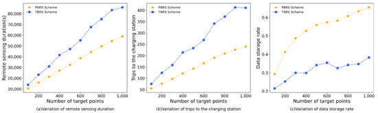 Figure 7 depicts the simulation results for increasing the number of target points from 100 to 1000. According to [24], the variation in the number of target points does not have a significant effect on the number of PADs deployed, since the number of PADs is mainly limited by the coverage of the UAV and the size of the region. In this simulation, the remote-sensing duration for the PBRS scheme was reduced by 48.26% compared to the TBRS scheme. Additionally, the number of trips to the charging station decreased by 71.48%, and there was a 69% increase in the data-storage rate.