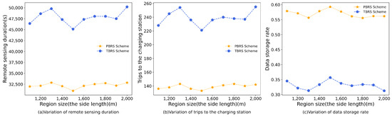 Figure 8 shows the simulation results for varying the remote-sensing region sizes, with side lengths growing from 1100 m to 2000 m; this is because the terrain data we use is not a regular rectangle but an irregular polygon with a maximum width of about 2000 m. In this simulation, the remote-sensing duration for the PBRS scheme was reduced by 48.33% compared to the TBRS scheme. Additionally, the number of trips to the charging stations decreased by 71.94%, and there was a 71.75% increase in the data-storage rate.