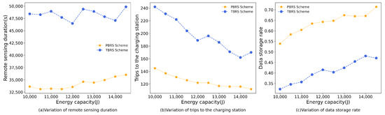 The energy-consumption trends for both the TBRS scheme and the PBRS scheme in Figure 9a exhibit fluctuations in an upward direction. The reason for this observation is that [24] takes into account the cost required to deploy PADs and seeks to use the minimum number of PADs in the region to enable the UAV to accomplish the mission. In [24], the energy capacity of the UAV determines the and . The higher the energy of the UAV, the larger and , which will change the number of PADs deployed and their locations. The increased energy of the UAV leads to a decrease in the number of PADs deployed, which means that each PAD covers more target points. And it also leads to an increase in the distance between charging stations and a greater distance between the target points and the nearest PADs, which increases the traveling time of the UAV. Meanwhile, Figure 9b illustrates a reduction in the trips to the charging stations for both algorithms as the battery capacity increased. This is due to the UAV’s increased energy capacity, which allows it to travel to more target points for remote sensing in a single flight without exceeding its storage capacity. As a result, the trips to the charging stations decreased while the data-storage rate of the UAV increased, as shown in Figure 9c.