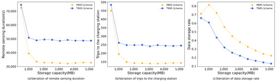 In the experiment of UAV storage capacity, we increased the storage capacity from 512 MB to 5 GB. In this simulation, the remote-sensing duration for the PBRS scheme was reduced by 38.29% compared to the TBRS scheme. Additionally, the number of trips to the charging stations decreased by 51.96%, and there was a 50.97% increase in the data-storage rate. Figure 10 shows the simulation results of the two schemes.