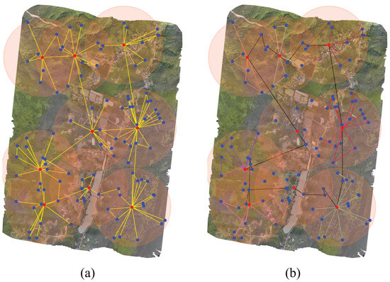 The problem of UAV route planning has become a hotspot of research in numerous related domains due to the energy limitation in terms of flight endurance and range of UAVs, thereby presenting substantial research potential [5]. The problem of UAV route planning holds significant relevance in the field of remote-sensing engineering, as it directly impacts the quality and efficiency of remote sensing. However, because of the limitations of battery capacity and its own weight, a single UAV’s flight-operating time and spatial coverage cannot match the needs of huge-region remote-sensing missions. As shown in Figure 1a, the UAV cannot travel to all target points in a single flight. Currently, there are three main methods for a huge-region remote-sensing mission: