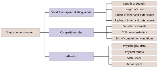 The simulation modeling of athletes is based on the basic physiological data of athletes, physiological fitness, state space and action space. The physiological data mainly include the height and weight of the athlete, the average windward area of the body while skating, and the upper and lower limits of the skating speed and acceleration. Physiological fitness is the embodiment of the residual endurance of athletes, and it is one of the key factors affecting the performance of athletes. The state space and action space contain the state data and action data of the athletes every 0.1 s. The overall simulation environment is shown in Figure 1: