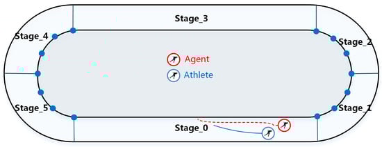 The state space mainly includes the two-dimensional coordinate information, ranking, physiological fitness, speed and the current stage. The action space contains motion direction d and acceleration a. After referencing a large amount of short track speed skating track data, we divide each lap of the race into six stages, as shown in Figure 2.