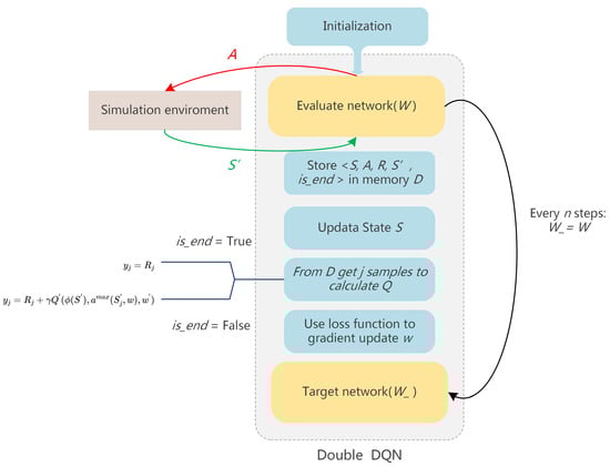 represents the current state, and represents the state after the agent performs action A. W and are the parameters of the evaluate network and target network, respectively. is the decay factor. R is the reward obtained with the reward function. Then the model updates the network parameters W by optimizing the loss function , and assigns the parameters of the evaluated network to the target network after updating the evaluation network every n time.