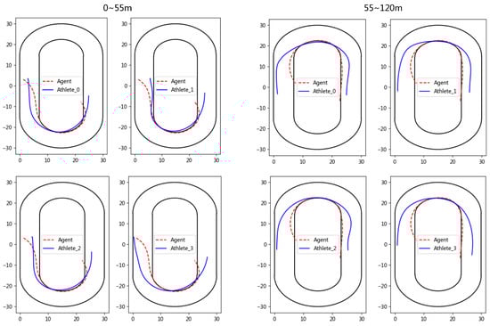 We randomly sample and visualize a group of test competition data for analysis, and mainly focus on the tactics of the first lap. As shown in Figure 6, it is clear that the agent is trained to enter the curve area and leave the curve area faster than the athlete, and the agent prefers to save energy in the straight and not surpass other athletes to gain the leading position. These data highlight the importance of the athlete effectively controlling the ankle and knee muscles during the curve section, as well as the ability of the athlete to anticipate body movements in advance.