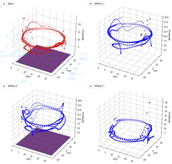 In order to see the speed change of the athletes and agents in the competition more intuitively, we visualize the three-dimensional information of position information and speed as shown in Figure 7. It can be seen that both the agent and the athlete increase their speed to the fastest skating speed in the second lap, which proves that the learning of physical energy allocation by the agent is almost no different from professional athletes. On the other hand, this also proves the scientific nature of our reward setting and also verifies the rationality of the physiological fitness distribution of the agent.