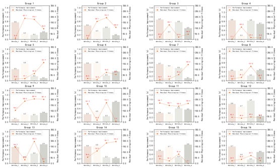In order to better reflect the efficiency of the tactical decision model on the performance improvement of athletes and the allocation of physiological fitness, we show the results of 16 groups of experiments in Figure 8, where the X-axis is the performance improvement of 4 athletes, and the Y-axis is the performance improvement in seconds and the residual physiological fitness. It can be clearly found that the performance-improved agent can use almost all the physiological fitness in the experiments compared with the athletes. However, the agent with less performance improvement could not use up all of its physiological fitness, which also shows that blindly saving physical strength without applying correct tactics will have an impact on the performance of the competition.