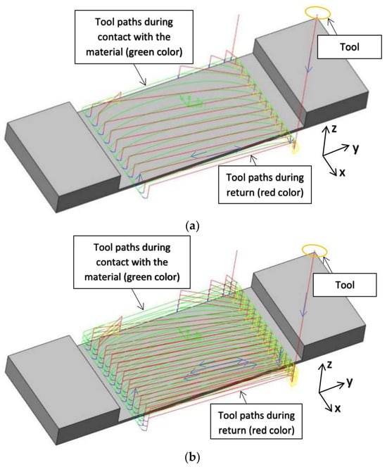 Milling paths: (a) adaptive face milling (large radial depth); (b) adaptive cylindrical milling (large depth of the cut).