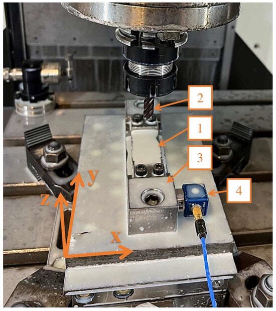 Experimental setup used during milling samples with horizontal thin walls: 1—sample, 2—tool, 3—adaptor, 4—vibration sensor.