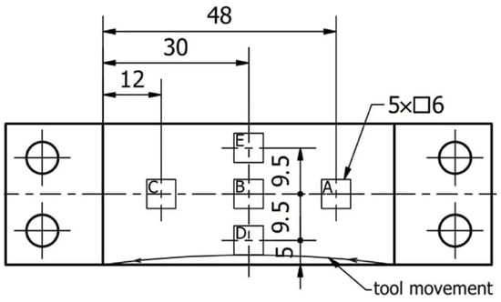 Surface topography parameters were determined in 5 areas marked A, B, C, D, and E in Figure 5 on the machined surface. For each selected area, 13 profiles 500 μm apart with a length of 6.0 mm were measured, with a measurement step of 1 μm and a measurement speed of 0.5 mm/s. Areas A, B, and C allowed the determination of surface topography parameters perpendicular to the direction of the tool’s feed motion, while areas D, B, and E pertained to the direction parallel to the tool’s feed motion.