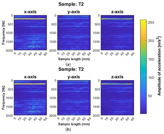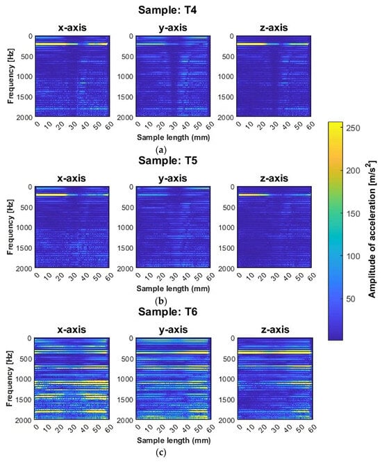 A similar distribution of plots between the corresponding components, as in the case of samples T1 and T2, was also noted for samples made with the same tools but using adaptive cylindrical milling (T4 and T5). For this strategy (adaptive cylindrical milling), a band for frequencies around 212 Hz also appeared both on the y and z axes, as well as on the x-axis (this was not the case for the T1 and T2 samples). In addition, a decrease in amplitude can be seen after reaching half of the sample length (about 30 mm), along with a blurring of the frequency bands from approximately 30 mm to approximately 50 mm, as in the case of samples T1 and T2 (made with the same tools, but with the opposite strategy).