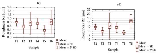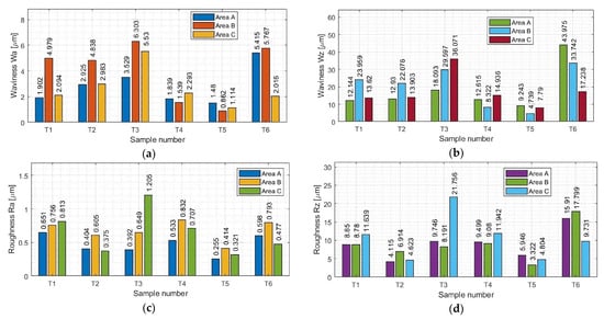 Statistical results for the processing of different samples: (a) waviness Wa; (b) waviness Wz; (c) roughness Ra; (d) roughness Rz.