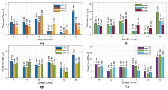 First, measurements were made for the areas A, B, and C (parallel to the direction of feed motion), followed by measurements for the areas D, B, and E (perpendicular to the direction of feed motion). In our work, area B is common and located in the center of the sample. A summary of the results pertaining to the surface topography is provided in Appendix A in Table A1 and Table A2. Based on the data contained in these tables, we have created graphical representations (in the form of histogram plots) of the arithmetic mean waviness Wa, the maximum height of the waviness Wz, the arithmetic mean deviation Ra, and the maximum height Rz. The results pertaining to the waviness and the roughness in areas A, B, and C are shown in Figure 8a–d, while those for areas D, B, and E are shown in Figure 8e–h.
