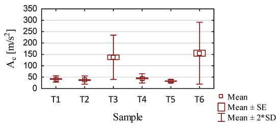 - Vibration—the maximum values of the three components of the acceleration vibration amplitudes for all full passes made in the sample processing were assumed. For statistical analysis, the total amplitude of acceleration vibration Ac was determined using vector folding of the components on the x, y, and z axes.