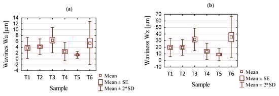 Considering the presented Wa and Wz waviness plots for all the tested samples, the smallest values were seen for the T5 sample milled with the tool for high-performance machining using adaptive cylindrical milling. For the sample machined using the opposite strategy and the same tool (T2), the waviness values were up to five times greater, and similar to those obtained with the tool for general purpose machining (T1). Samples milled with the tool for high-speed machining (T3 and T6) presented the largest values of Wa and Wz waviness parameters in their strategies (i.e., comparing samples T1, T2, and T3 with each other and comparing samples T4, T5, and T6 with each other) compared to the other samples. The results for samples T3 and T6 were unstable and irregular, with no apparent dependence in their distribution.
