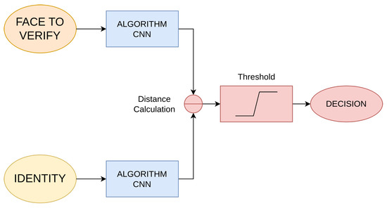 11]. In other words, two identical neural networks with the same network model/structure and the same weights. Two images are also needed. The first one is a picture of the face of the person already verified. The second one is a picture of the person to be verified. These pictures go through the Siamese neural network, obtaining as output two different vectors that can be compared as they are the result of the same neural network. Then, the distance between them is calculated. If the distance is above the threshold, the decision is that they are not the same person. If it is below the threshold, it is concluded that they are the same person.
