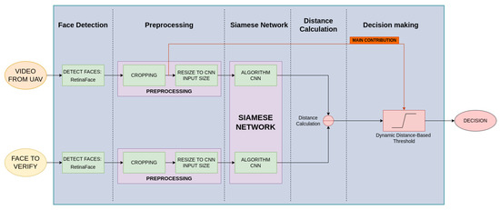 Block diagram of the proposed face verification pipeline composed of five stages: face detection, preprocessing, Siamese network, distance calculation, and decision making. There are two inputs: a video from a UAV and the face of the person to identify, and an output that is the decision.