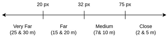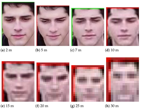 Currently, most face verification techniques are performed at close distances. For instance, when a phone is unlocked using face verification, it is usually positioned 30 cm from the face. At this distance, all the features of the face can be captured with a high resolution; therefore, face verification can be performed without significant difficulties using state-of-the-art technologies. However, if face verification is performed from a UAV, it is not possible to position it at 30 cm from the face due to safety reasons. Thus, the UAV has to be at long distances, which vary depending on its size. It is noted that most face verification algorithms are optimised for close distances. Moreover, face verification is usually effective at a fixed distance or within a small range, whereas, for a UAV-based use case, the distance between a face and the UAV is significantly higher; thus, the size of the face in pixels varies and the low pixel resolution of a face introduces significant difficulties in face verification, imposing the challenge of developing new techniques to improve the accuracy of these algorithms when face verification is carried out from longer distances.