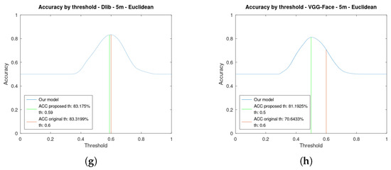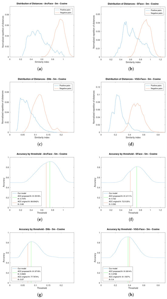 Distribution of the similarity indexes and accuracy by threshold at 5 m of the four algorithms using cosine distance as metric. (a) Distribution of Similarity indexes of ArcFace. (b) Distribution of Similarity indexes of SFace. (c) Distribution of Similarity indexes of Dlib. (d) Distribution of Similarity indexes of VGG-Face. (e) Accuracy by threshold of ArcFace. (f) Accuracy by threshold of SFace. (g) Accuracy by threshold of Dlib. (h) Accuracy by threshold of VGG-Face.