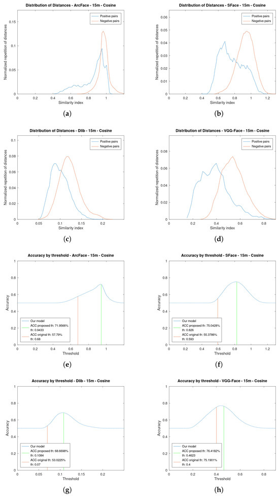 Distribution of similarity indexes and accuracy by threshold at 15 m of the four algorithms using cosine distance as metric. (a) Distribution of Similarity indexes of ArcFace. (b) Distribution of Similarity indexes of SFace. (c) Distribution of Similarity indexes of Dlib. (d) Distribution of Similarity indexes of VGG-Face. (e) Accuracy by threshold of ArcFace. (f) Accuracy by threshold of SFace. (g) Accuracy by threshold of Dlib. (h) Accuracy by threshold of VGG-Face.