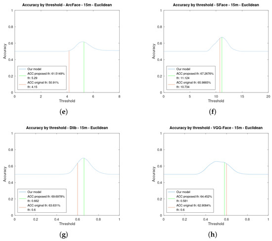 Distribution of the similarity indexes and accuracy by threshold at 15 m of the four algorithms using Euclidean distance as metric. (a) Distribution of Similarity indexes of ArcFace. (b) Distribution of Similarity indexes of SFace. (c) Distribution of Similarity indexes of Dlib. (d) Distribution of Similarity indexes of VGG-Face. (e) Accuracy by threshold of ArcFace. (f) Accuracy by threshold of SFace. (g) Accuracy by threshold of Dlib. (h) Accuracy by threshold of VGG-Face.