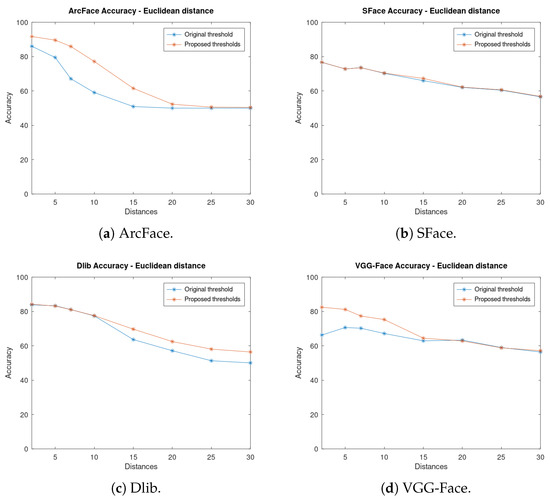 Accuracy of the algorithms at fixed distances using the original and the proposed thresholds and Euclidean distance as metrics.