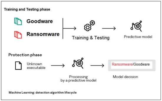 As [] states, the application of intelligent algorithms to detect ransomware is in an early stage but is growing. New perspectives of future developments are still ahead in this research area. As shown in Table 1, the following studies use machine learning algorithms to classify ransomware from goodware: [,,,,,,,,,].