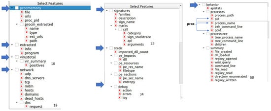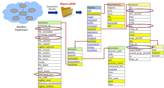 A report has a tree-based structure. An application to select features in the different levels was developed. For example, the attributes marked with yellow were chosen in the first stage, as seen in Figure 2. The first level contains several categories, such as “Info” or “procmemory”. To begin the extraction process, the application visualizes the type of data stored in each category. The JSON cuckoo sandbox reports are recursively loaded since there were nested directories, and the program looks up every JSON file contained in a given directory.