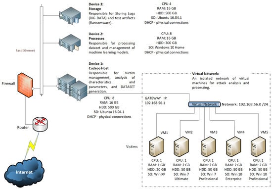 Figure 3 shows the final test environment network topology. In this configuration, the experiments use three machines; the first hosts cuckoo, the second CPU processes the models with machine learning, and the third machine is responsible for storing logs (big data) and artifacts for testing. Cuckoo communicates with an isolated virtual network for ransomware processing and analysis composed of CPUs in five platforms: Windows XP Service Pack3, Windows 7 Ultimate, Windows 7 Professional, Windows 10 Enterprise, and Windows 10 Professional.