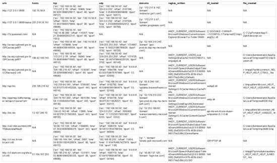 For instance, the “network” category contains features such as “hosts” and “dns”; “dns” includes the “request” feature. The program extracts all data collected in these features and writes the data contained in a list of any primitive data type or a list of dictionaries to a CSV extension file. This file is the feature vector input in the machine learning algorithms used to generate models to detect locker ransomware, encryptor ransomware, or goodware [].