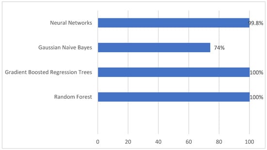 - The 10-fold cross-validation accuracy, precision, recall, and F1 values obtained with the final dataset, using random forest and gradient boosted regression trees, are practically perfect, ensuring the threat’s detection with a processing time in the range of seconds. Other studies have detection results comparable to or lower than the ones obtained in our research.