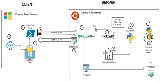 A sandbox is a quarantined environment that enables the malware to be executed by implementing specific security mechanisms to guarantee the environment’s integrity []. A sandbox can store information about the artifact’s behavior run within it. This information is later sent back to the environment where the sandbox analyzes the recorded behavior []. The implementation of a sandbox varies depending on what is monitored []. A sandbox based on virtual machines is commonly used [].