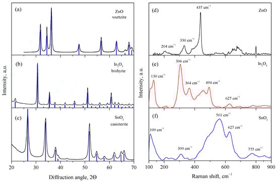 XRD patterns of synthesized nanocrystalline ZnO (a), In2O3 (b), and SnO2 (c) powders and Raman spectra of synthesized nanocrystalline ZnO (d), In2O3 (e), and SnO2 (f) powders.