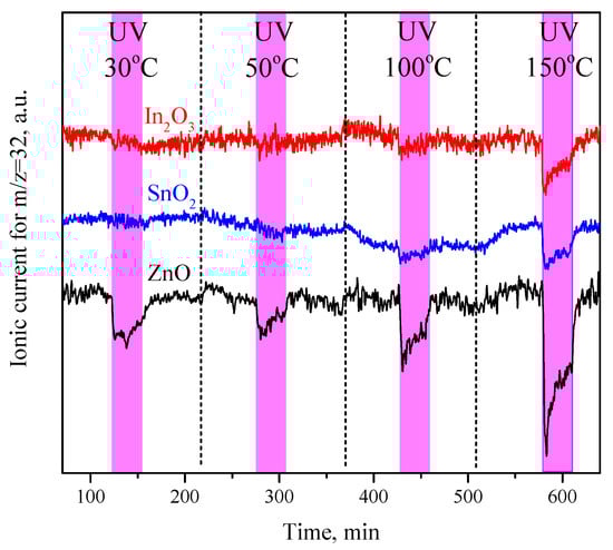 Figure 2 shows the mass spectra for m/z = 32 obtained from the analysis of a helium-oxygen carrier gas passed through a cell with samples of metal oxides at temperatures of 30, 50, 100, and 150 °C. UV irradiation was carried out at each temperature for 30 min. The tablets were annealed in air at 300 °C immediately before the measurements. For all three studied samples under UV light, a decrease in the oxygen concentration in the carrier gas was noted, which indicates a shift in the adsorption equilibrium
